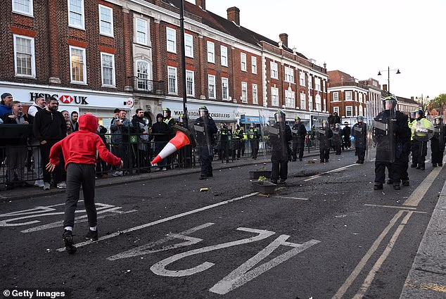 Un cono stradale vola verso la polizia armata a Epsom mercoledì sera mentre scoppiavano proteste nella lussuosa città del Surrey
